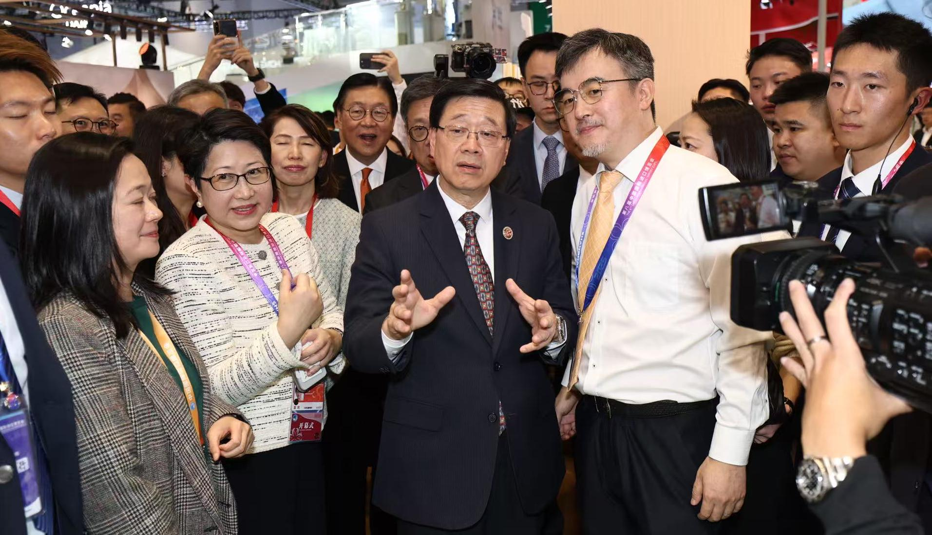 香港特区行政长官李家超与香港馆参展商小主执行董事韩喜阳深入交流
